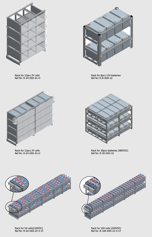 成组支架为组合式,分电池垂直安装(极柱向上)和水平安装(极柱前置)两类,可根据现场面积灵活布局。